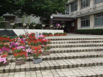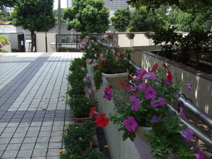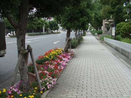 正門前の街路(昨年6月に建設局と区役所、本校元気アップ地域本部と区役所で植樹帯の利用に関する覚書を締結しています)には、4月〜5月に種から育てたマリーゴールド・ペチュニア・サルビアが見事に咲き誇り、通学路を明るい雰囲気にしてくれています。