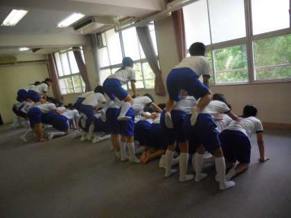 女子は多目的教室で「ピラミッドウエーブ」