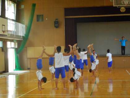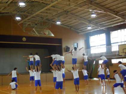 男子は体育館で「2人組」「3人組」の練習をしていました