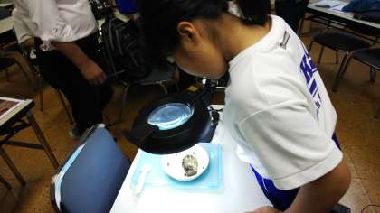 持ち帰った土壌から生き物を探します。とても根気のいる作業ですが、これで渡り鳥の餌が十分に足りているのかを知ることができます。