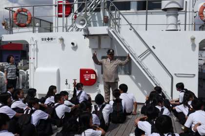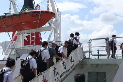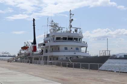 6月12日大阪港中央突堤に広島丸がやってきました。この船は、本校第1期生の清田(せいだ)さんが船長をしている広島商船高等専門学校の練習船です。3年生が大崎上島に修学旅行にい行った折交流しました。本校1年生に特別に見学させていただきました。
