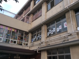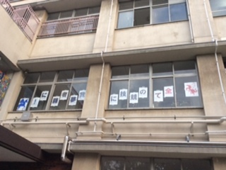 正門を入って右側、2階図書室前の窓に掲示されました。