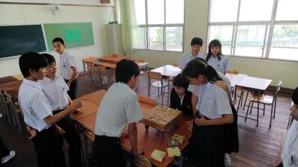 将棋を指せる教育実習の先生に、3年生男子が挑戦しました。男子生徒は右四間飛車、教育実習の先生は四間飛車で展開中です。チャレンジテストがありますので、教育実習の先生の封じ手で明日対局再開です。詰むや、詰まざらんや!?