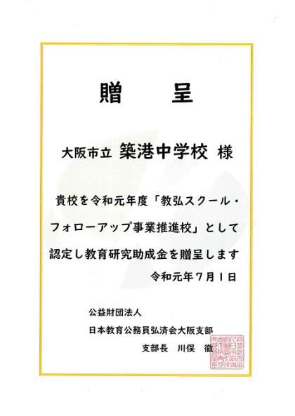 公益財団法人日本教育公務員弘済会大阪支部より、「教弘スクールフォローアップ事業推進校」の認定を受け、教育研究助成金の贈呈式がありました。校長からは、生徒たちの学力向上とその定着に向けて、教材・教具の購入に活用させていただきたい。と、お礼の言葉を述べられていた。