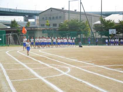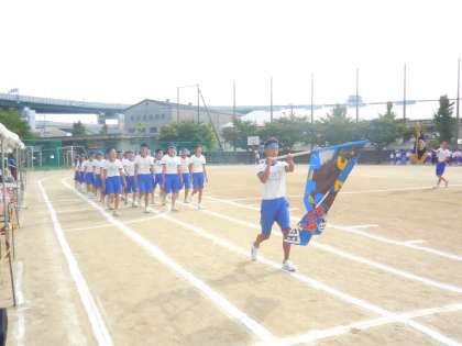 続いて、オレンジ色の旗を先頭に、3年1組の入場です。緊張しながら堂々の行進です。
