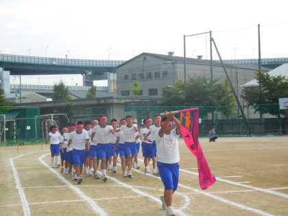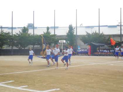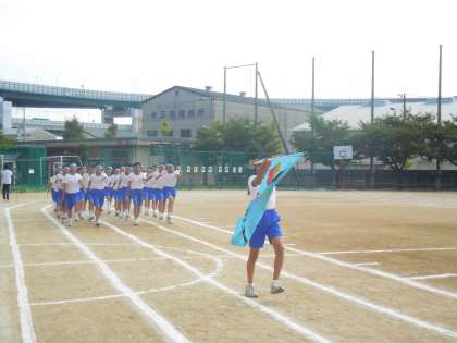 水色の旗を先頭に、2年2組の入場です。