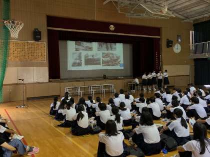 3年生は、修学旅行でヒロシマの平和学習を行った報告をしました。実際の資料や被爆体験を聞いて感じたことをもとに、撮ってきた写真をまとめて発表しました。