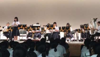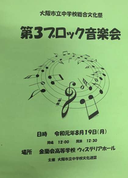 吹奏楽部は、8月19日(土)金蘭会高等学校ウィステリアホールで行われた「第3ブロック音楽会」に出演しました。これには港区・中央区・西区・大正区から、吹奏楽部・合唱部・軽音楽部の13校約400人の生徒が出演しました。吹奏楽部は庄司先生の指揮で「ルパン3世のテーマ」「名探偵コナンのテーマ」の2曲を一生懸命演奏しました。見に来ていただいた、多くの保護者・教職員の皆さん応援ありがとうございました。