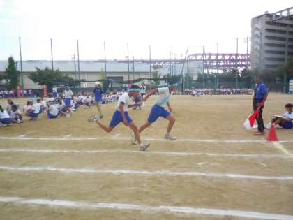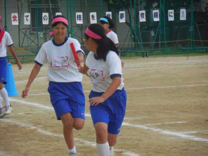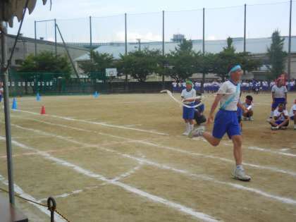 ピンクのハチマキ1組と水色のハチマキ2組は、抜きつ抜かれつ大接戦!