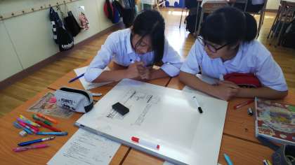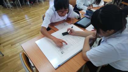 数学の授業の様子です。いつも活用しているタブレットに加えて、グループ学習に最適な『まなボード』を使ってみました。プリントをはさんでそれぞれの意見を書き込み、相談しながら学習を進めることができます。いつもの班学習よりも熱心に取り組んでいましたので、これからも活用していきたいと思います。