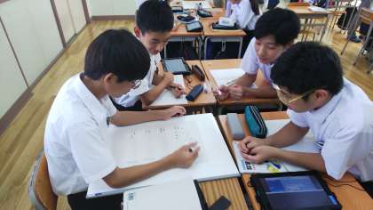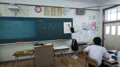 3年生の数学の授業の様子です。みんなでまなボードを使って学習する中で、とても素晴らしい解法を見つけた生徒さんがいましたので、黒板にまなボードを張って発表してもらいました。若い中学生の発想力には脱帽です。
