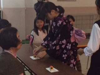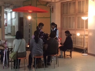 築港中学校の夜間展示は10月31日(木)のお茶室から始まりました。午後6時半から7時まで保護者の方々20名以上の参加がありました。