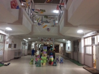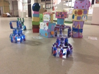 今年の1階のピロティ展示は光を意識しています。1年生の平和のペットボトルモニュメントは光源が下にあります。優しい光を放っています。