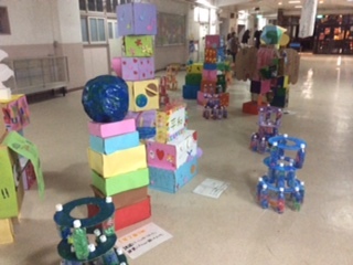 段ボールの平和を象徴するモニュメントは班ごとに話あってどんな形にするかどんなふうに作るかを考えました。文化祭当日、2年生や3年生に「平和を象徴しているか」「オリジナリティが感じられるか」「班のチームワークが感じられるか」の3観点で投票してもらいます。どの班も工夫してがんばって前向きに制作していました。