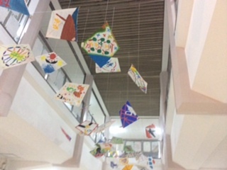 2年生は個人で和凧を制作しました。夏休みの課題で下描きを考えて2学期に一息に下描きから着彩まで仕上げました。それぞれ個性的な作品がピロティの2階に空間に飛びます。天気の良い日に学年全体で凧を揚げる日が楽しみです。