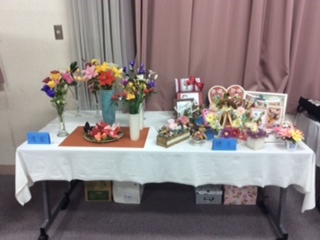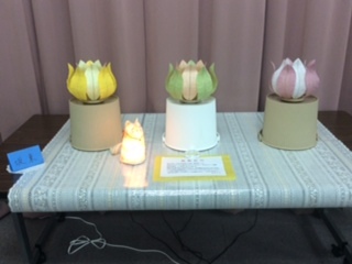 多目的室ではPTAの方々の手作り作品が展示されています。ここでもやはり灯り。和紙のランプシェードなど心のこもった作品の数々です。