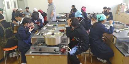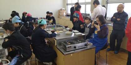 試食会。あなごの細巻き、すまし汁、骨せんべい。おいしそう!