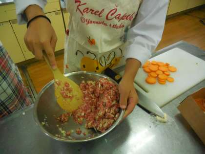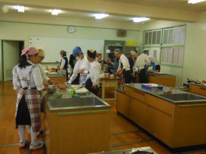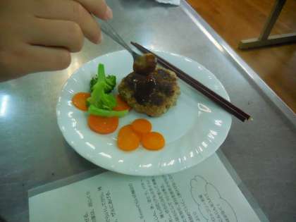 2年生家庭科で調理実習をしました。メニューは「ハンバーグステーキ」、付け合せは「にんじんのグラッセ、ブロッコリー」です。手でなく木べらを使ってこねても、ふっくらとおいしいハンバーグができました。50分で作って食べて片付けまで行う実習です。あわただしいですが、手順をしかっり考えて協力してほとんどの班ができます。さあ次は何の実習でしょうか。