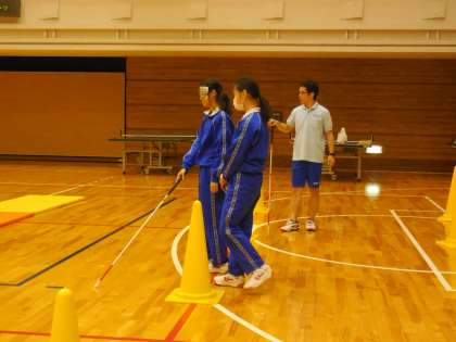 続いて白杖体験を行いました。2人で歩く時と違い、1人で白杖を使って歩くのは心細かったようです。