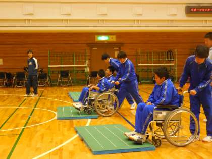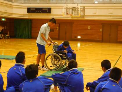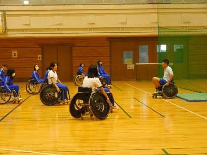 続いて、車いすバスケット用の車いすに乗って、車いすバスケット体験を行いました。動き方、ルールなどを教えてもらった後、実際に車いすにのって動きました。