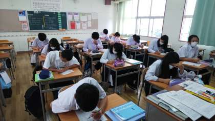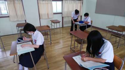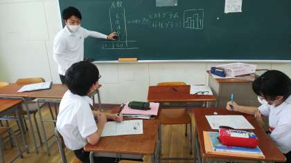 4限目の2年生Bの3分割授業です。同じく期末テスト対策で『資料の活用』の勉強をしました。とっても静かで、集中して取り組んでいました。