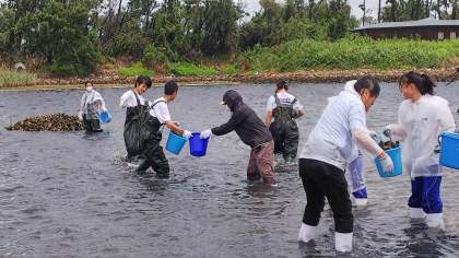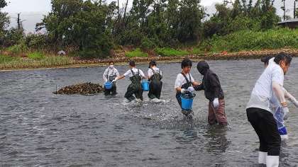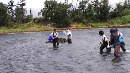 胴長チームは水深の深いところで体をはって、山を作っていきます。ご苦労様です。