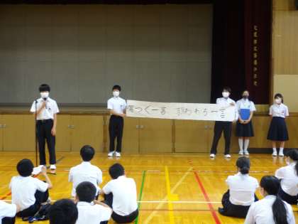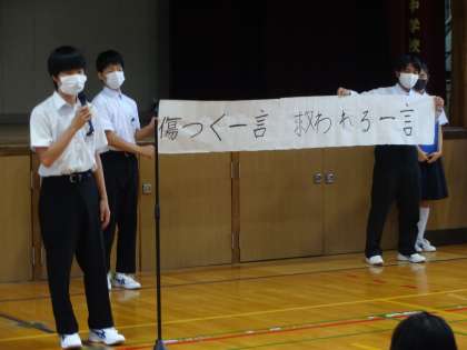 全校集会で生徒会から「いじめについて考える日」のスローガンが発表されました。