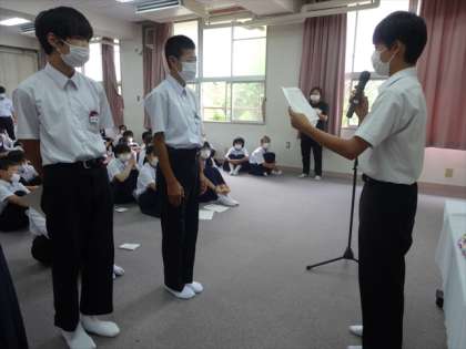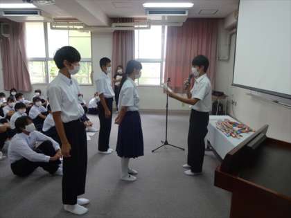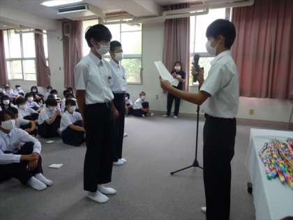 6時限、終業式のあとに生徒会主催チャイム着席運動の表彰式がありました。スーパーパーフェクト賞は2年1組・3年1組でした。パーフェクト賞は1年1組でした。