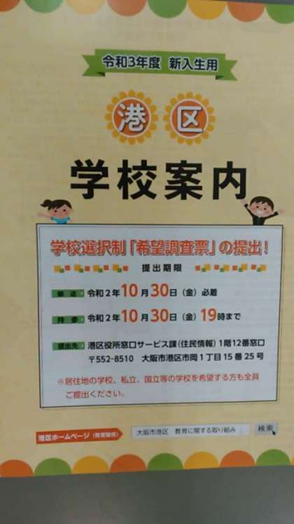 学校公開説明会の詳細は、8月末、小学校で配布された「令和3年度 新入生用 港区 学校案内」または、https://www.city.osaka.lg.jp/minato/page/0000512692.htmlをご覧ください。