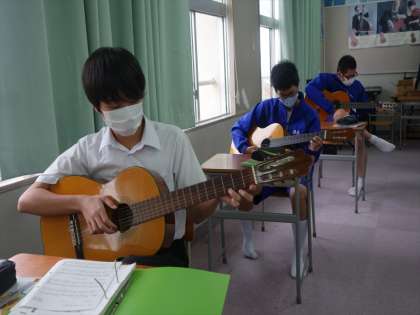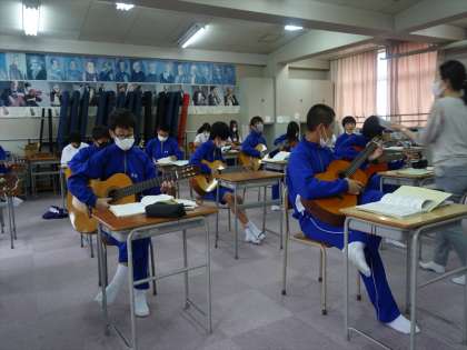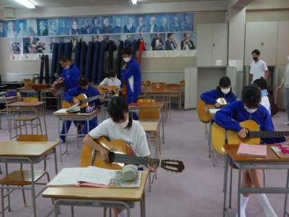 なにー、音楽がある。ギターのテストだー。休み時間から音楽室で、テストに備え練習中。