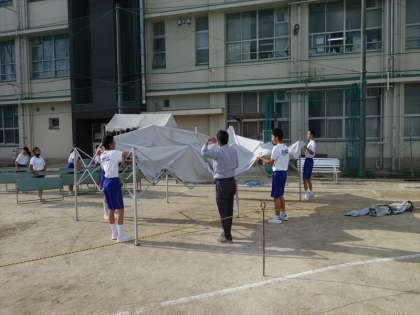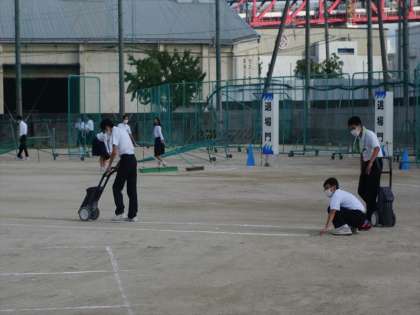 6限授業終了後、みんなで分担どおり準備に取り掛かりました。ラインを引いたり、テントを立てたり、椅子を運んだり、思い出に残る体育大会ができるよう協力をした。
