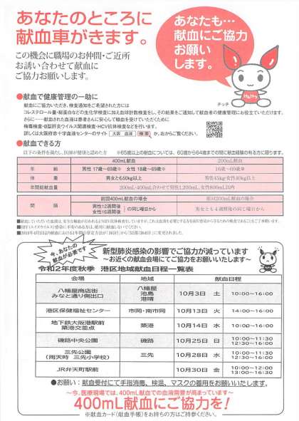 大阪府赤十字血液センターより依頼があり、チラシを配布しました。