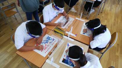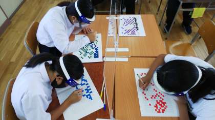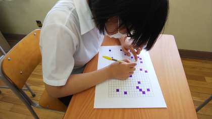 みんなの絵を合わせると1つの見事な作品が完成します。それまでは何の絵を塗っているのかまったく分かりません。その時の感動を信じて、修行のように黙々と塗り続けています。