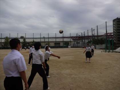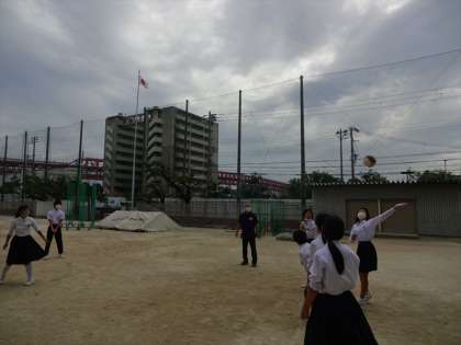 昼休み、各学年とも運動場でバレーボールをしていました。1年生には堺T、奥村Tが、2年生には鈴木T、3年生には校長Tが服を着替えて参加していました。みんなでバレーボールを楽しんでました。