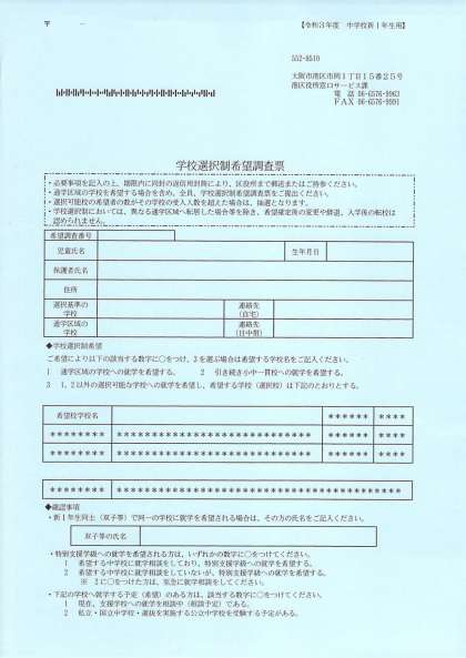 上の写真は、学校選択制希望調査票 見本