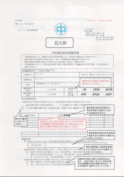中の写真は、学校選択制希望調査票 記入例