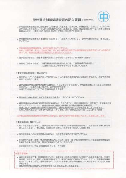 下の写真は、学校選択制希望調査票 記入要領(中学校用) を