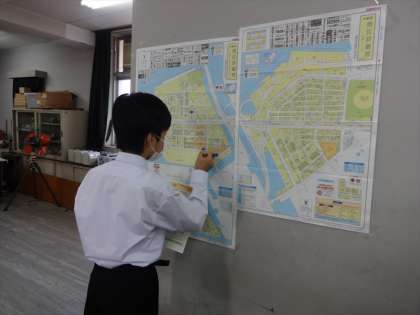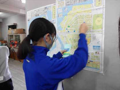 測定した結果に対応した色のシールを地図にはり、地図を見てNO2測定結果を確認。