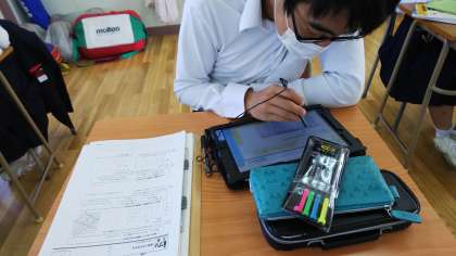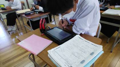 2年生の数学の授業です。2年生も『すららドリル』で1次関数の式を求める演習をしています。こちらもみんな真面目に取り組んでいます。