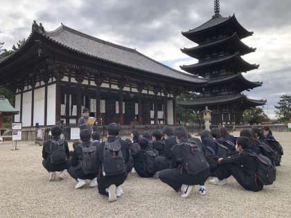 本日は2年生も校外学習です。2年生は奈良市内を班で散策します。先ほど興福寺に到着しました。これから自分たちで計画したルートで班行動開始です。気をつけていってらっしゃい!