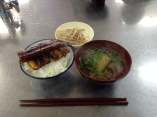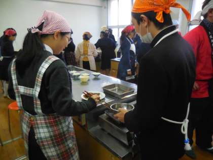 あなごの加工方法を学習した後、いよいよ食べるために実習です。全員であなごにたれをつけながら網で焼いていきます。香ばしい香りが調理室に広がり、「おいしそう!早く食べたい!」と生徒は興奮気味。学校元気アップボランティアの方が「ご飯」をたいてくださいました。あなご汁も準備していただいています。特別に、あなごの骨せんべいもみんなに配っていただき、「いただきます!」