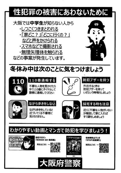 大阪府警察本部より、冬休み中の諸注意のプリントが届きました。