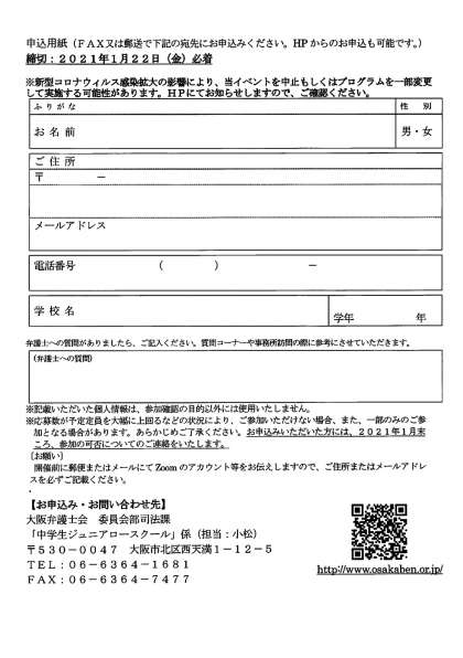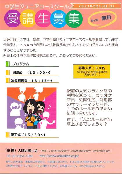 中学生ジュニアロースクール受講生募集(2021年2月13日開催)の案内が届きました。 今年は、zoomを利用した法教育授業を中心とするプログラムにより実施されます。