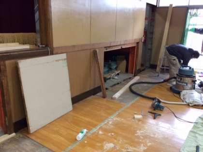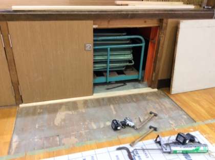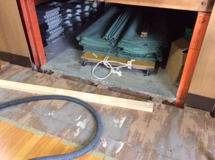 体育館のステージ下部分が、シロアリと雨漏りの影響で腐食しパイプ椅子の出し入れにも困る状況でしたので、補修工事を行っています。不便をおかけいたしますが、ご理解をお願いします。