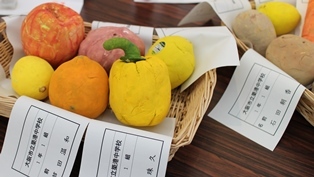 1年生は紙粘土で野菜や果物を見ながら制作した「そっくりを作ろう」です。合計30名の作品を展示しています。