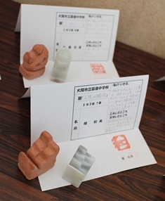 先週の火曜日から鶴見緑地の咲くやこの花館で大阪市立中学校の造形展が開催されています。今年度は築港中から3年生の「いのち」をキーワードにテーマを見つけ篆刻の鈕としての立体で表現。テラコッタ粘土での塑像の試作品も同時に展示しています。
