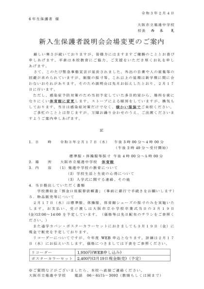 【6年生保護者の皆様へ】 本日2月17日 新入生保護者説明会 【標準服・体操服等採寸も本日実施】