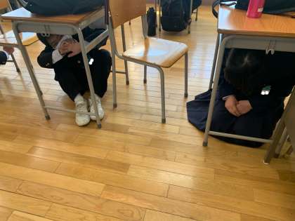 金曜日の6限目、1・2年生合同で避難訓練を実施しました。緊急地震速報が流れるとすぐに机の下にもぐり、揺れが落ち着いたのちにグラウンドに移動。その後津波がくると想定して4階に避難をしました。みんなが迅速に行動してくれたので、とても良い訓練になりました。『備えあれば憂いなし』何も起こらないに越したことはないですが、しっかりと対策しておきましょう。