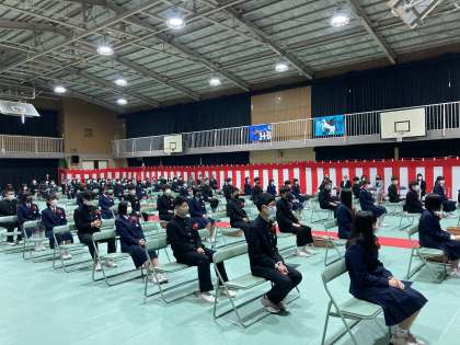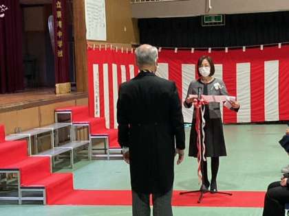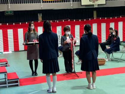 3年生の保護者より先生方への花束贈呈を見ている卒業生