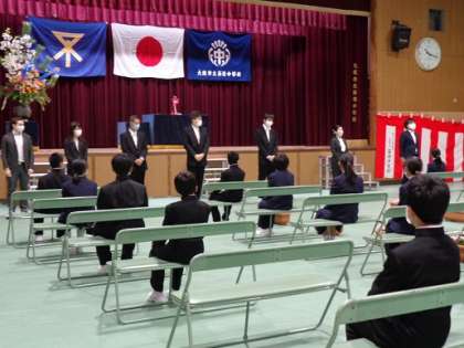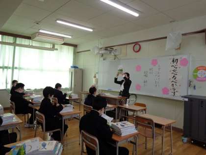 新入生が今後お世話になる先生方の紹介です。新入生だけでなく、在校生にとっても注目の瞬間です。式終了後は教室に上がり、教科書の確認をしました。小学校よりも分厚い教科書に驚きです。